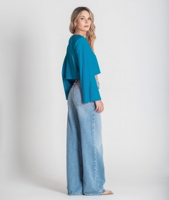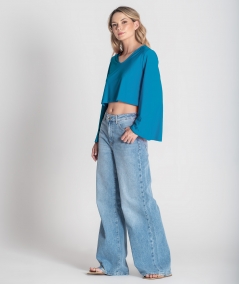 Camisola decote em v com mangas largas.
