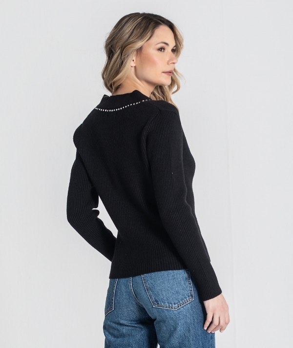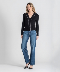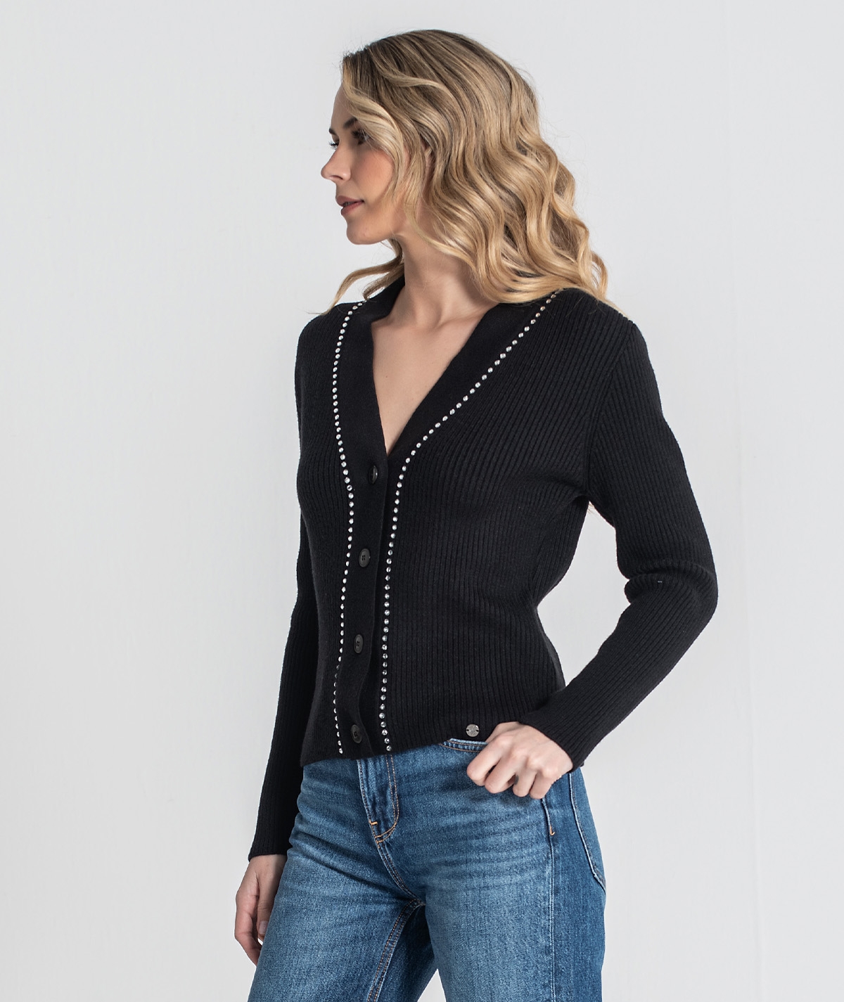 Ribbed cardigan with beading at the neckline. Fastens in the front with buttons.